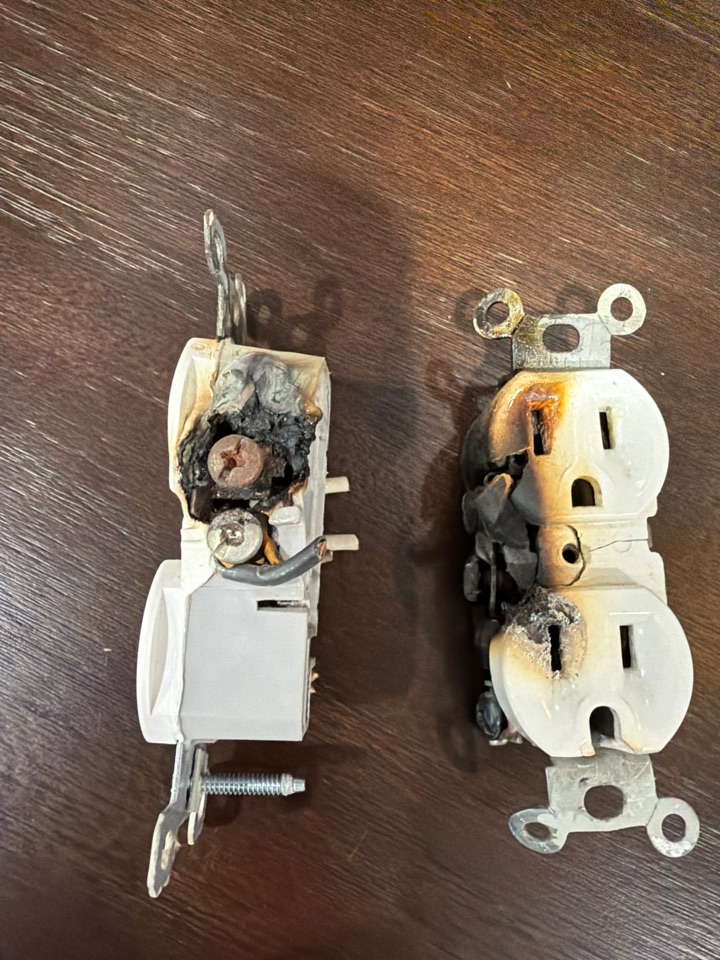 Electrical Repair: Responded to an urgent call for a smoking outlet in the kitchen. Shut down power to the affected circuit, removed outlet, and inspected wiring. Found melted insulation and a burned receptacle due to loose connections. Replaced the outlet and damaged wiring, resecured connections, restored power, and tested to confirm safe operation.